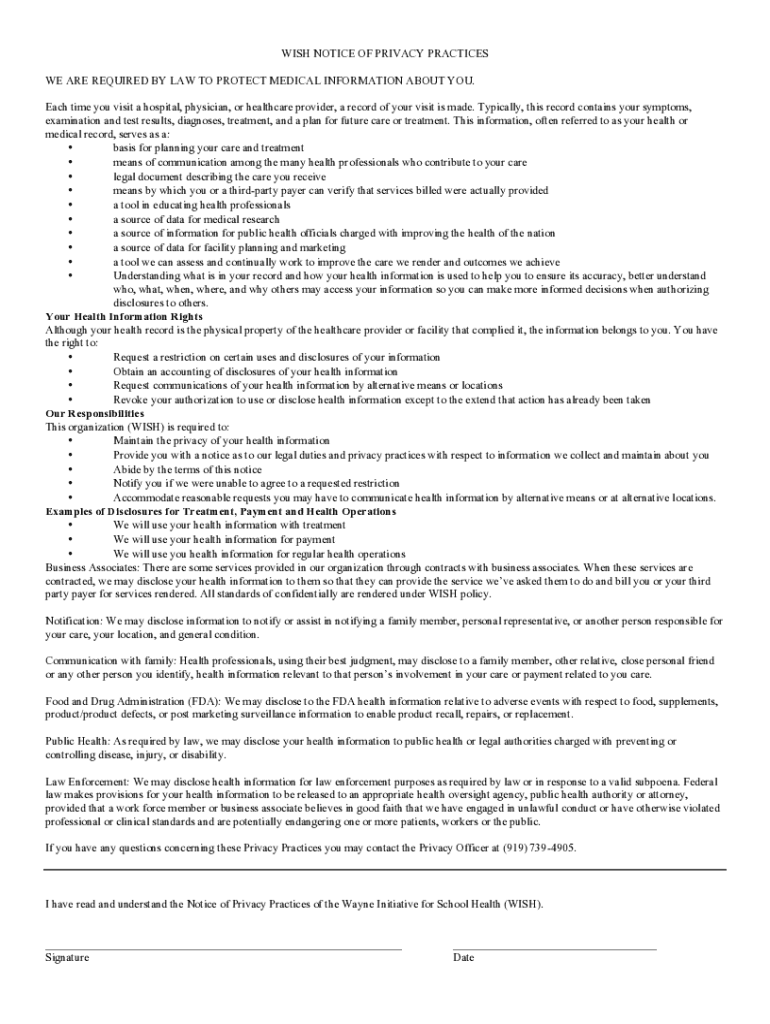WISH NOTICE OF PRIVACY PRACTICES WE ARE REQUIRED BY LAW TO PROTECT MEDICAL INFORMATION ABOUT YOU. Each time you visit a hospital, physician, or healthcare provider, a record of your visit is made.