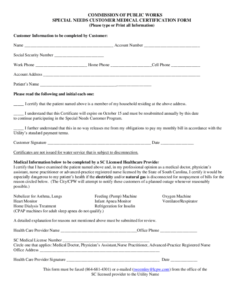 COMMISSION OF PUBLIC WORKS SPECIAL NEEDS CUSTOMER MEDICAL CERTIFICATION FORM (Please type or Print all Information) Customer Information to be completed by Customer: Name ___ Account Number ___ Social