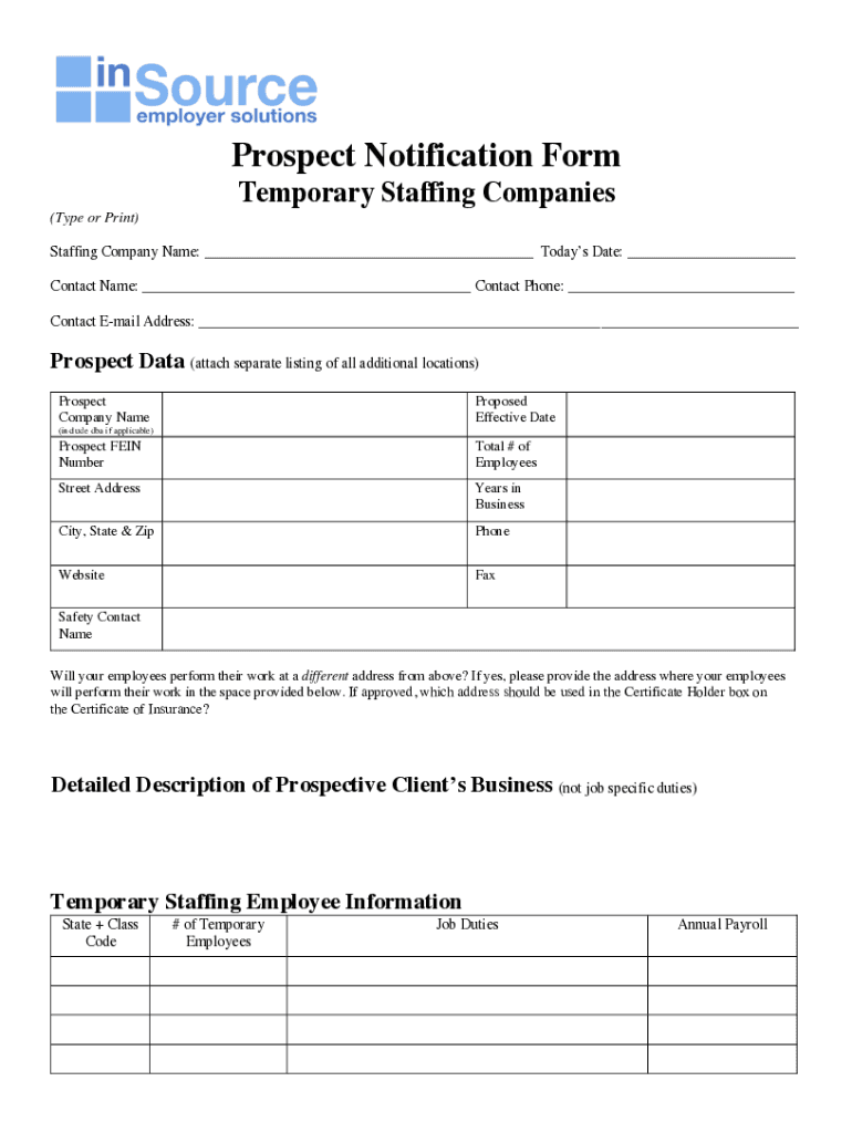 Prospect notification form is a form submitted to notify authorities about potential business opportunities or projects.