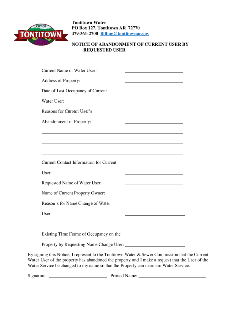 Pottstown Water PO Box 127, Pottstown AR 72770 4793612700 Billing@tontitownar.gov NOTICE OF ABANDONMENT OF CURRENT USER BY REQUESTED Undercurrent Name of Water User:___Address of Property:___Date