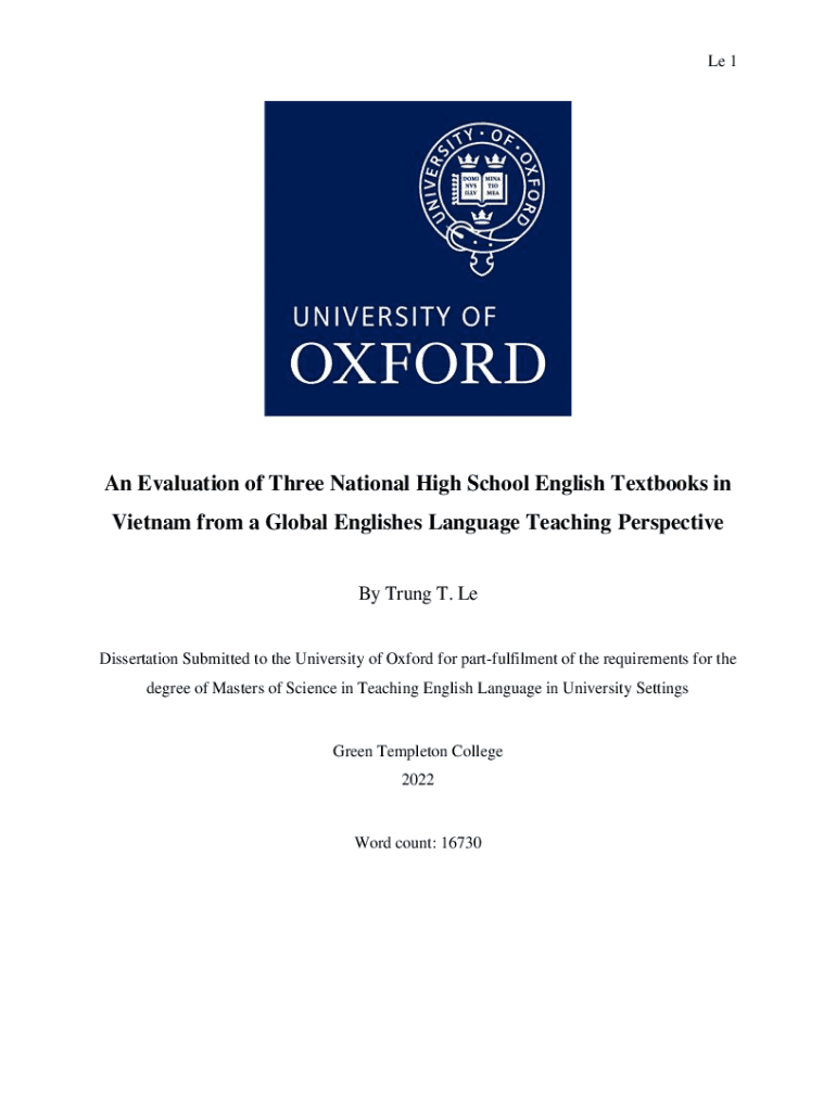 Le 1An Evaluation of Three National High School English Textbooks in Vietnam from a Global Englishes Language Teaching Perspective By Trunk T. Le Dissertation Submitted to the University of Oxford