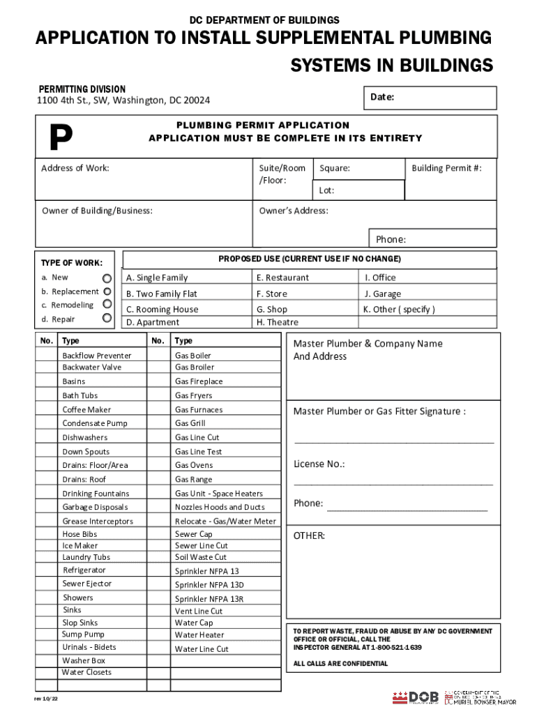 DC DEPARTMENT OF BUILDINGSAPPLICATION TO INSTALL SUPPLEMENTAL PLUMBING SYSTEMS IN BUILDINGS PERMITTING DIVISION 1100 4th St., SW, Washington, DC 20024PDate:PLUMBING PERMIT APPLICATION MUST BE COMPLETE