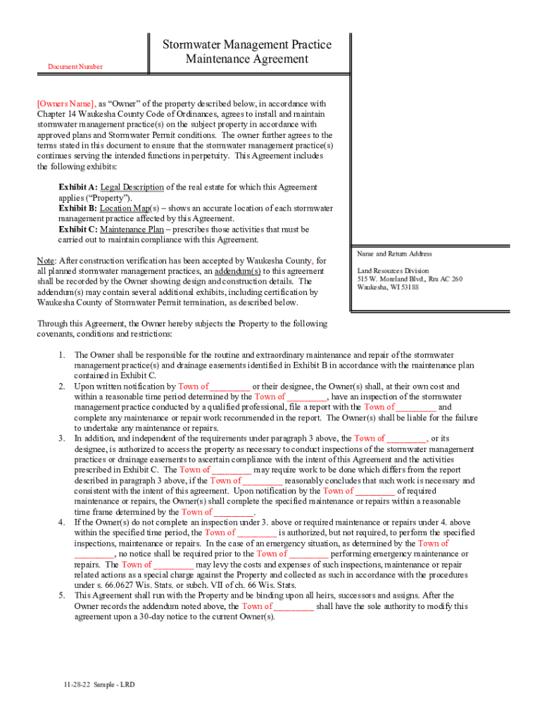 Document NumberStormwater Management Practice Maintenance Agreement[Owners Name], as Owner of the property described below, in accordance with Chapter 14 Waukesha County Code of Ordinances, agrees