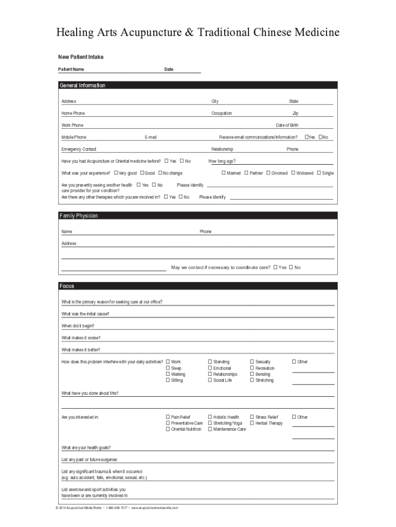 Healing Arts Acupuncture & Traditional Chinese Medicine New Patient Intake Patient NameDateGeneral Information AddressCityStateHome PhoneOccupationZip Date of BirthNoMarriedAre you presently seeing