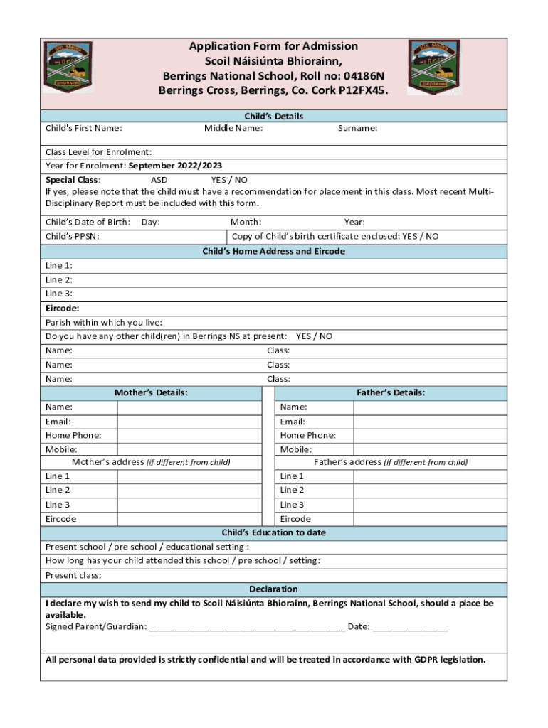 Get the free Application Form for Admission Scoil Nisinta Bhiorainn, Berrings ...