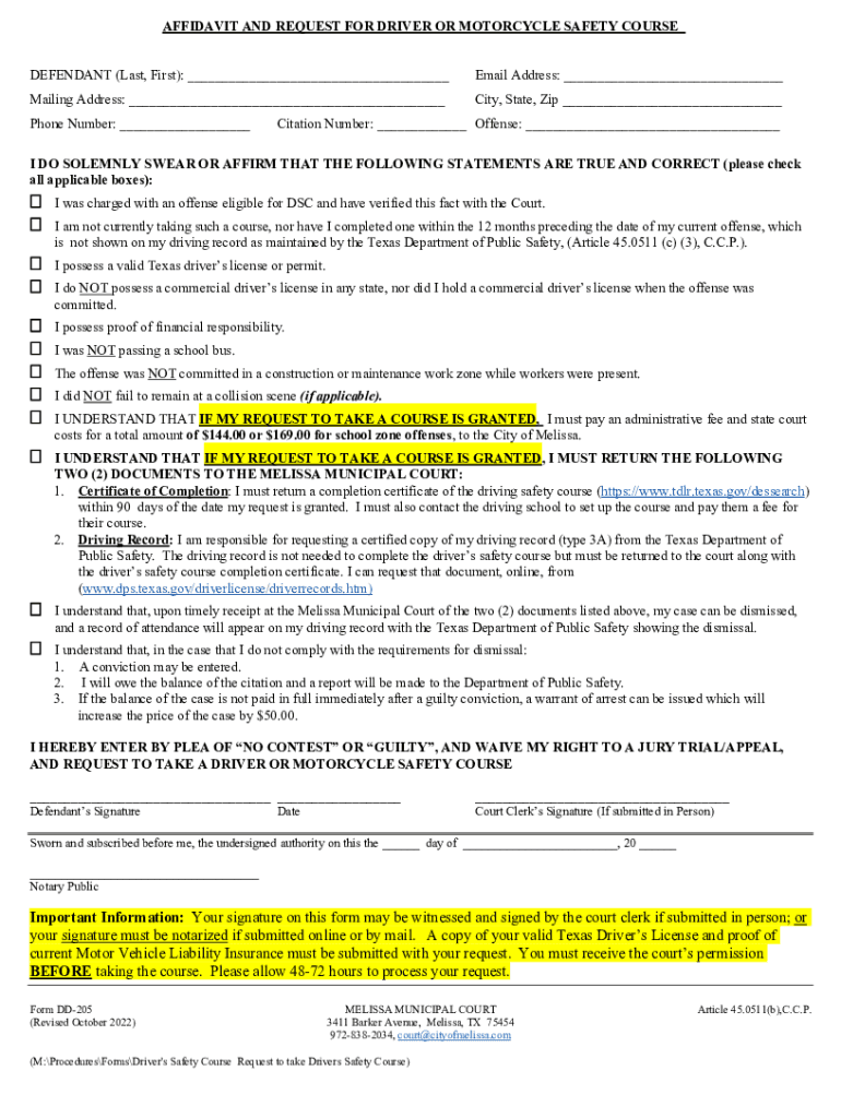 AFFIDAVIT AND REQUEST FOR DRIVER OR MOTORCYCLE SAFETY COURSE DEFENDANT (Last, First): ___Email Address: ___Mailing Address: ___City, State, Zip ___Phone Number: ___Citation Number: ___ Offense: ___I