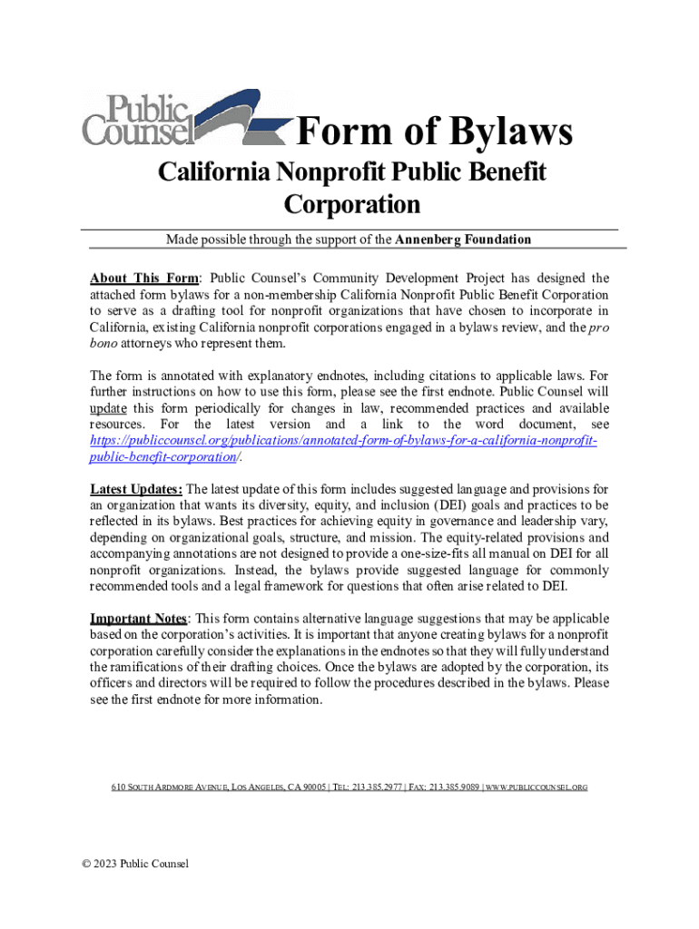 Form of Bylaws California Nonprofit Public Benefit Corporation Made possible through the support of the Vandenberg FoundationAbout This Form: Public Counsels Community Development Project has designed