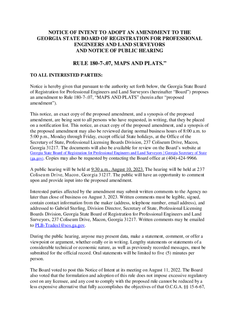 NOTICE OF INTENT TO ADOPT AN AMENDMENT TO THE GEORGIA STATE BOARD OF REGISTRATION FOR PROFESSIONAL ENGINEERS AND LAND SURVEYORS AND NOTICE OF PUBLIC HEARINGRULE 1807.07, MAPS AND PLATS. TO ALL INTERESTED
