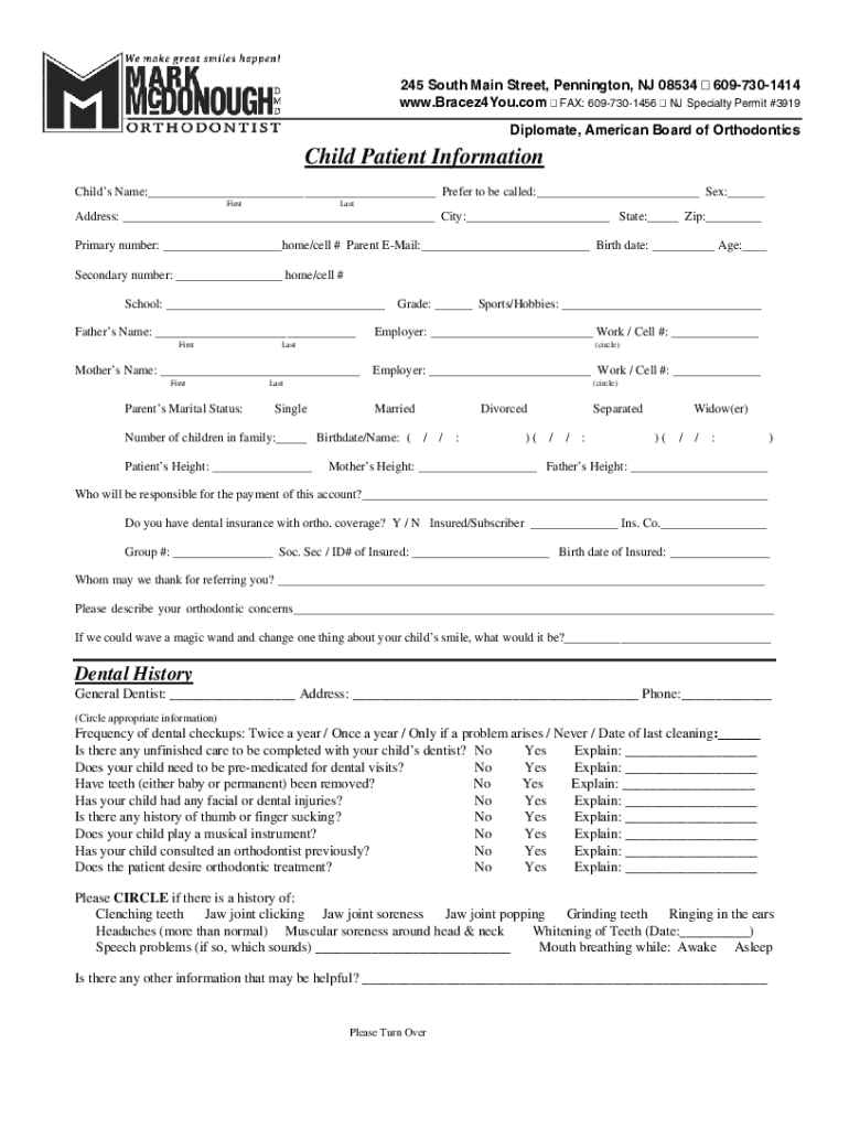 245 South Main Street, Pennington, NJ 08534 6097301414 www.Bracez4You.com FAX: 6097301456 NJ Specialty Permit #3919 Diplomat, American Board of OrthodonticsChild Patient Information Child's Name:___