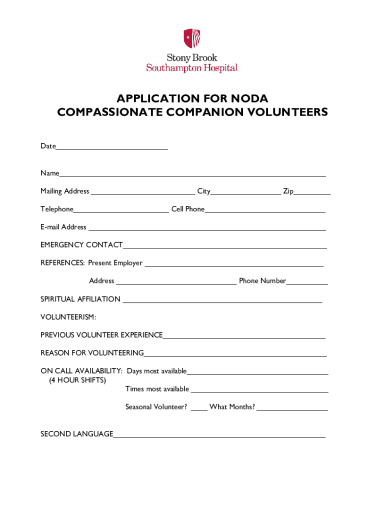 APPLICATION FOR NOVA COMPASSIONATE COMPANION VOLUNTEERS Date___ Name___ Mailing Address ___ City___ Zip___ Telephone___ Cell Phone___ Email Address ___ EMERGENCY CONTACT___ REFERENCES: Present Employer