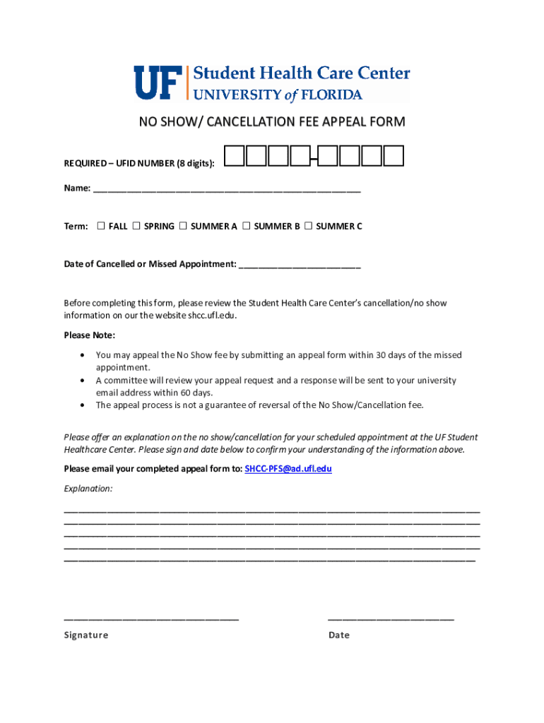 Get the free NO SHOW/ CANCELLATION FEE APPEAL FORM - shcc ufl