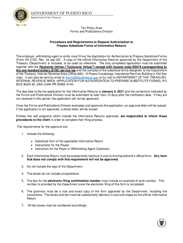 Rev. 11.20Tax Policy Area Forms and Publications DivisionProcedures and Requirements to Request Authorization to Prepare Substitute Forms of Informative Returns employer, withholding agent or entity