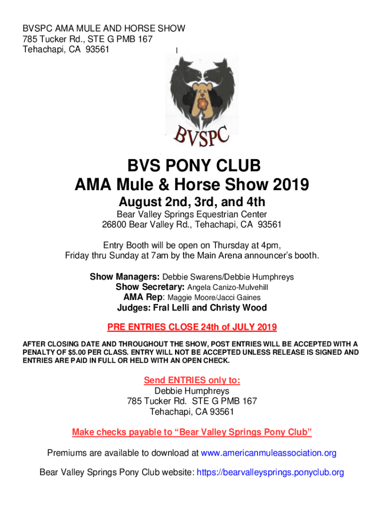 BVS PC AMA MULE AND HORSE SHOW 785 Tucker Rd., STE G PMB 167 Tehachapi, CA 93561BVS PONY CLUB AMA Mule & Horse Show 2019 August 2nd, 3rd, and 4th Bear Valley Springs Equestrian Center 26800 Bear Valley