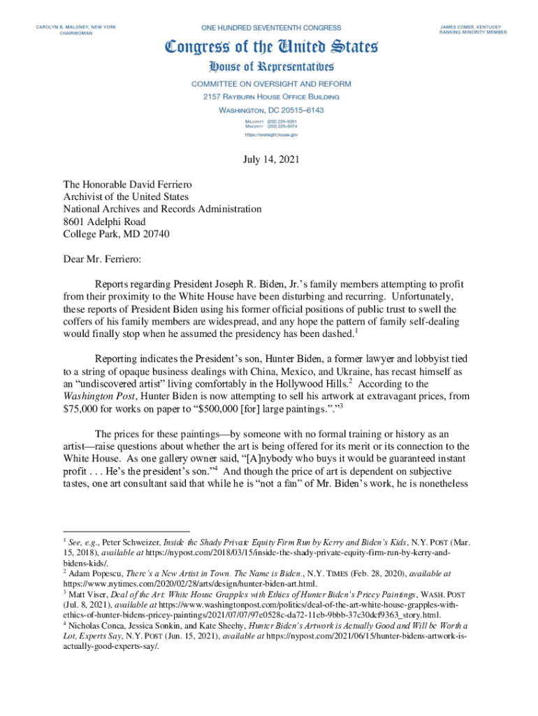 July 14, 2021, The Honorable David Ferraro Archivist of the United States National Archives and Records Administration 8601 Delphi Road College Park, MD 20740 Dear Mr. Ferraro: Reports regarding President