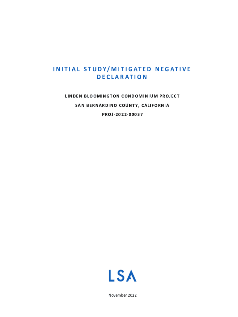 I N I T I A L S T U D Y/ M I T I G AT E D N E G AT I V E D E C L A R AT I O N LI NODE N BLOG O MI NG TO N CO NO MI NI UM PRO JE CT SA N BE RNA RDI NO CO UNT Y, CA LI FOR NIA PRO J 2 0 2 2 0 00 3 7LSA