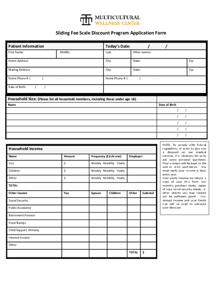 Sliding Fee Scale Discount Program Application Form Patient InformationTodays Date:First Name:Middle://Last:Other names:Home Address:City:State:Zip:Mailing Address:City:State:Zip:Home Phone #: (Date