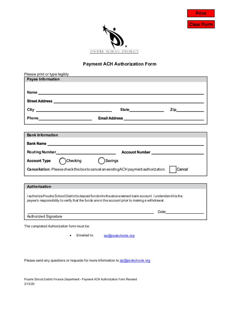 Print Clear Repayment ACH Authorization Form Please print or type legibly Payee Information NameCityStateZipPhoneBank InformationRouting NumberCancellation: Please check this box to cancel an existing