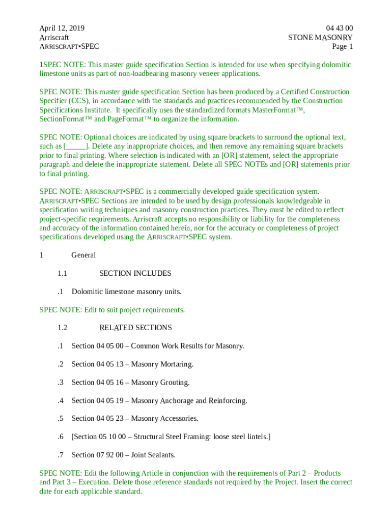 Instructions for the form Concrete Unit Masonry Guide Spec