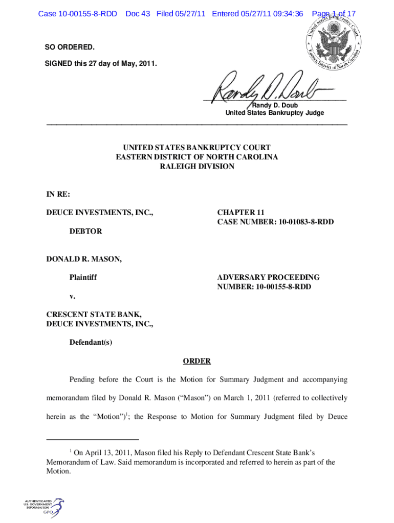 Get the free Case 10-00155-8-RDD Doc 43 Filed 05/27/11 Entered ...