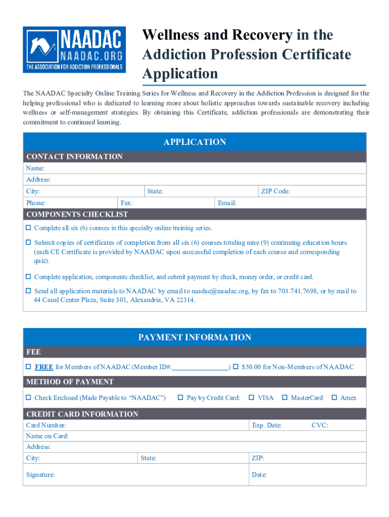 Wellness and Recovery in the Addiction Profession Certificate Application The NAFDAC Specialty Online Training Series for Wellness and Recovery in the Addiction Profession is designed for the helping