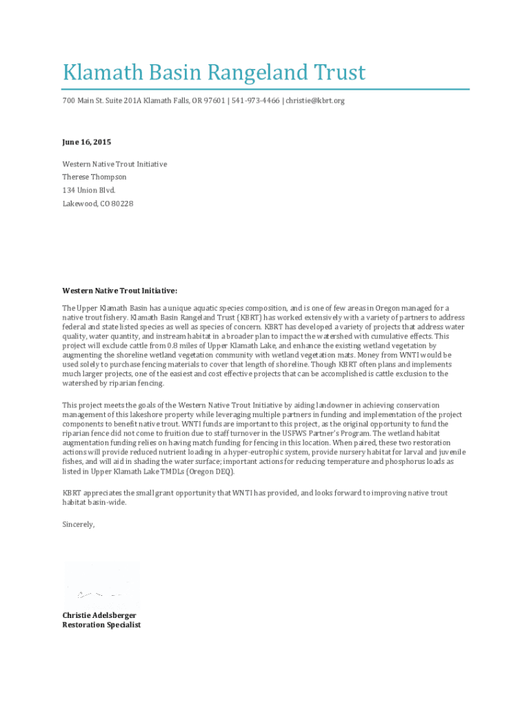 Namath Basin Rang eland Trust 700 Main St. Suite 201A Klamath Falls, OR 97601 | 5419734466 | christie@kbrt.orgJune 16, 2015Western Native Trout Initiative Therese Thompson 134 Union Blvd. Lakewood,