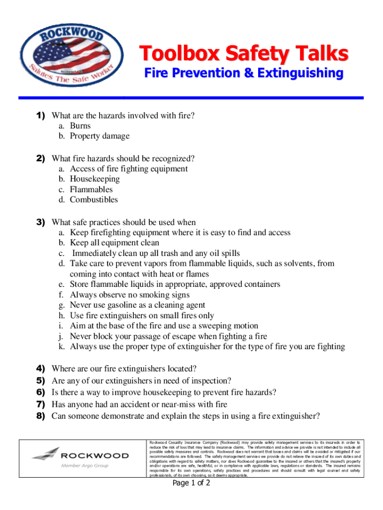 Toolbox Safety Talks Fire Prevention & Extinguishing1) What are the hazards involved with fire? a. Burns b. Property damage 2) What fire hazards should be recognized? a. Access of fire fighting equipment
