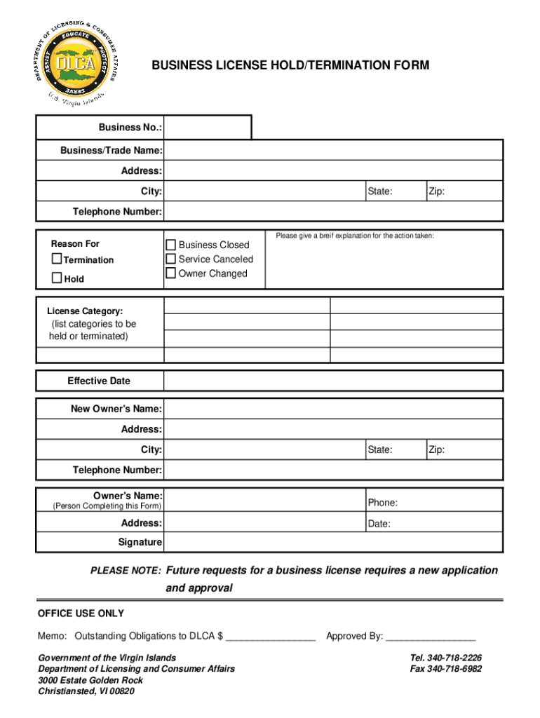 BUSINESS LICENSE HOLD/TERMINATION Agribusiness No.: Business License No. Business/Trade Name: Address: State:City:Zip:Telephone Number: Please give a brief explanation for the action taken:Reason