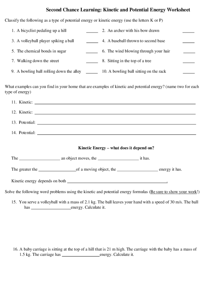 Second Chance Learning: Kinetic and Potential Energy Worksheet Classify the following as a type of potential energy or kinetic energy (use the letters K or P) 1. A bicyclist pedaling up a hill2. An