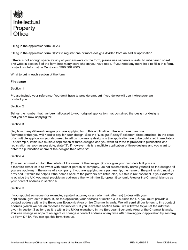 Filling in the application form DF2B Filling in the application form DF2B to register one or more designs divided from an earlier application. If there is not enough space for any of your answers