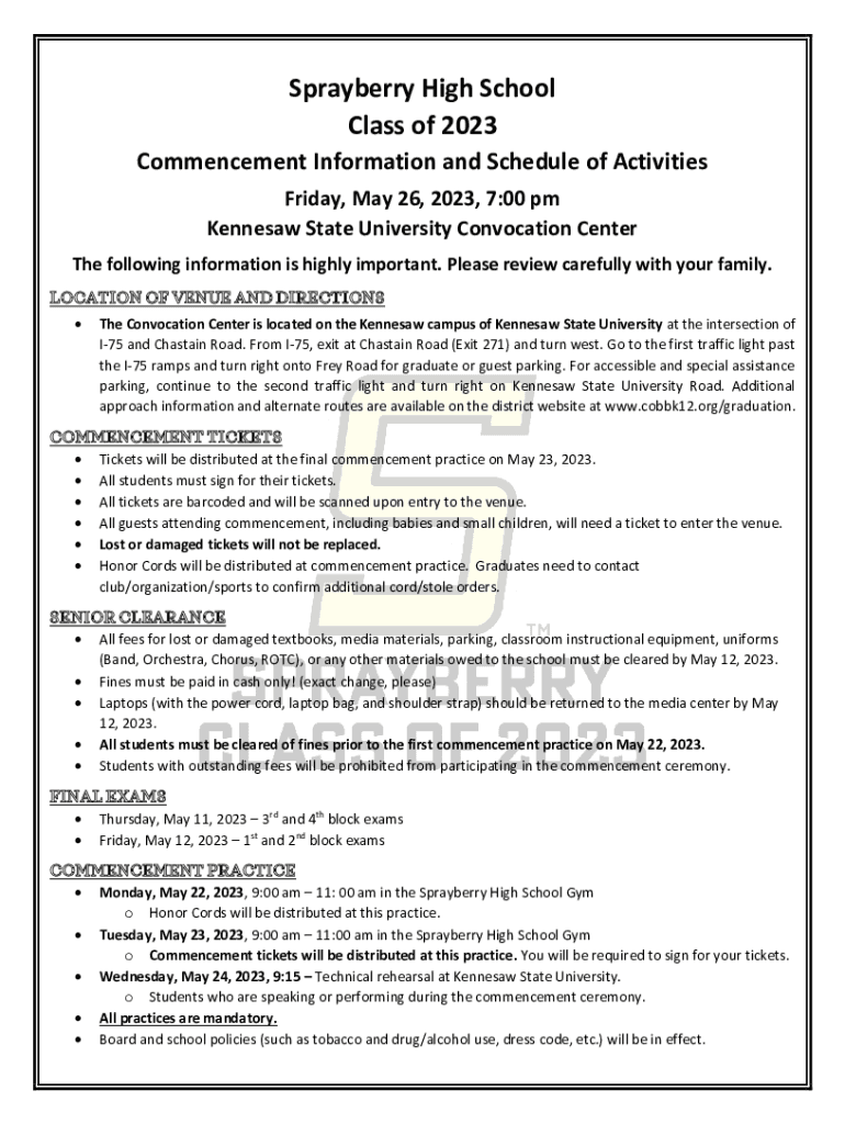 Spray berry High School Class of 2023 Commencement Information and Schedule of Activities Friday, May 26, 2023, 7:00 pm Kennesaw State University Convocation Center The following information is highly