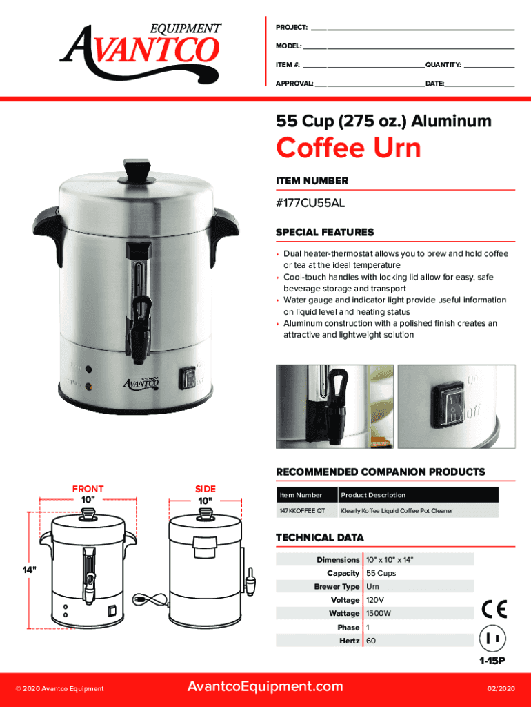 PROJECT:___ MODEL:___ ITEM #:___QUANTITY:___ APPROVAL:___DATE:___55 Cup (275 oz.) AluminumCoffee Urn ITEM NUMBER#177CU55AL SPECIAL FEATURES Dual heater thermostat allows you to brew and hold coffee