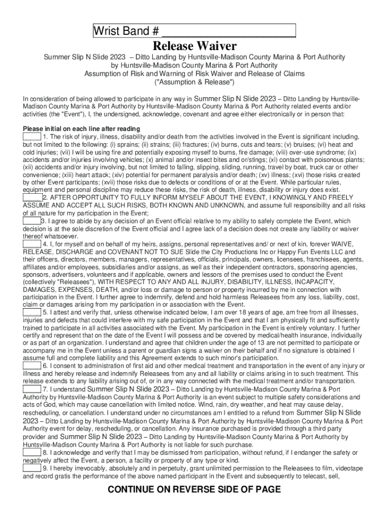 Wrist Band # ___Release Waiver Summer Slip N Slide 2023 Ditto Landing by Huntsville Madison County Marina & Port Authority by Huntsville Madison County Marina & Port Authority Assumption of Risk and