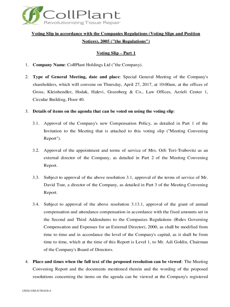 Voting Slip in accordance with the Companies Regulations (Voting Slips and Position Notices), 2005 (\” the Regulations\”) Voting Slip Part 1 1. Company Name: Coloplast Holdings Ltd (\” the Company).