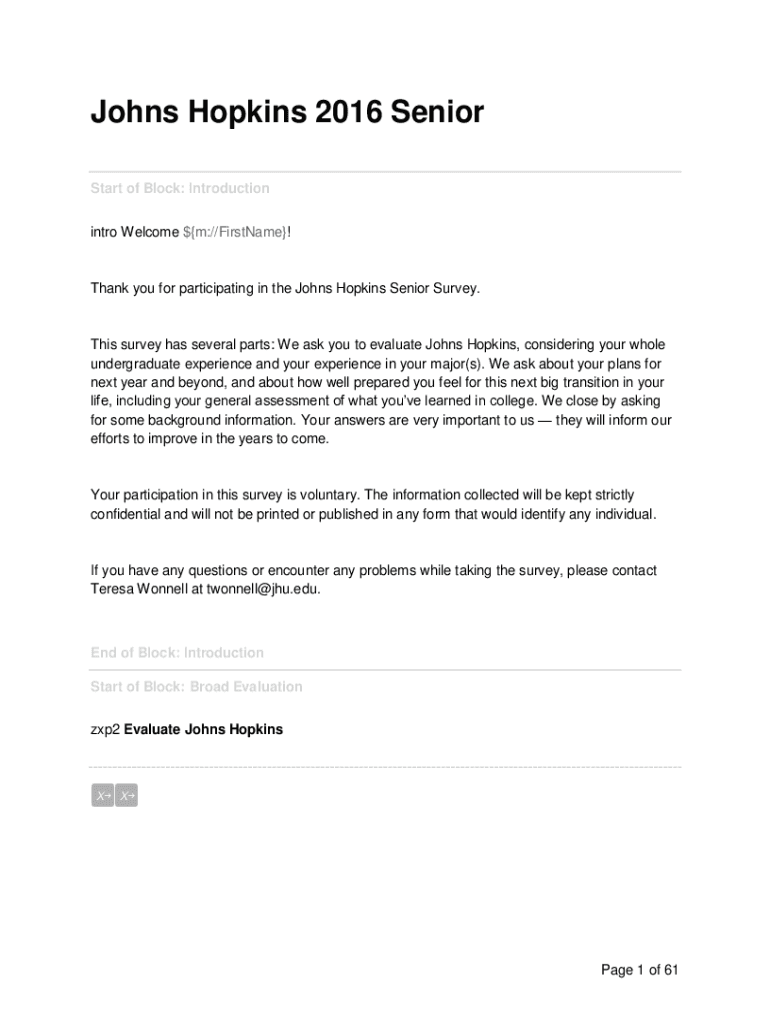 Johns Hopkins 2016 Senior Start of Block: Introduction intro Welcome km://Filename! Thank you for participating in the Johns Hopkins Senior Survey. This survey has several parts: We ask you to evaluate