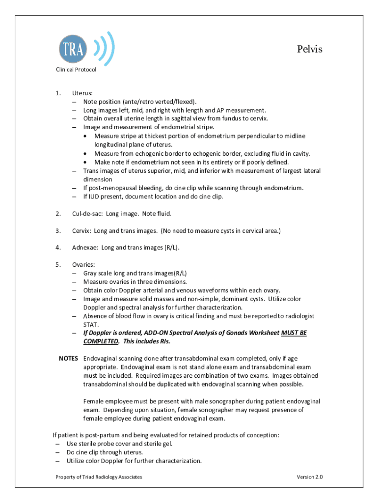 Pelvis Clinical Protocol1. Uterus: Note position (ante/retro vertex/flexed). Long images left, mid, and right with length and AP measurement. Obtain overall uterine length in sagittal view from funds