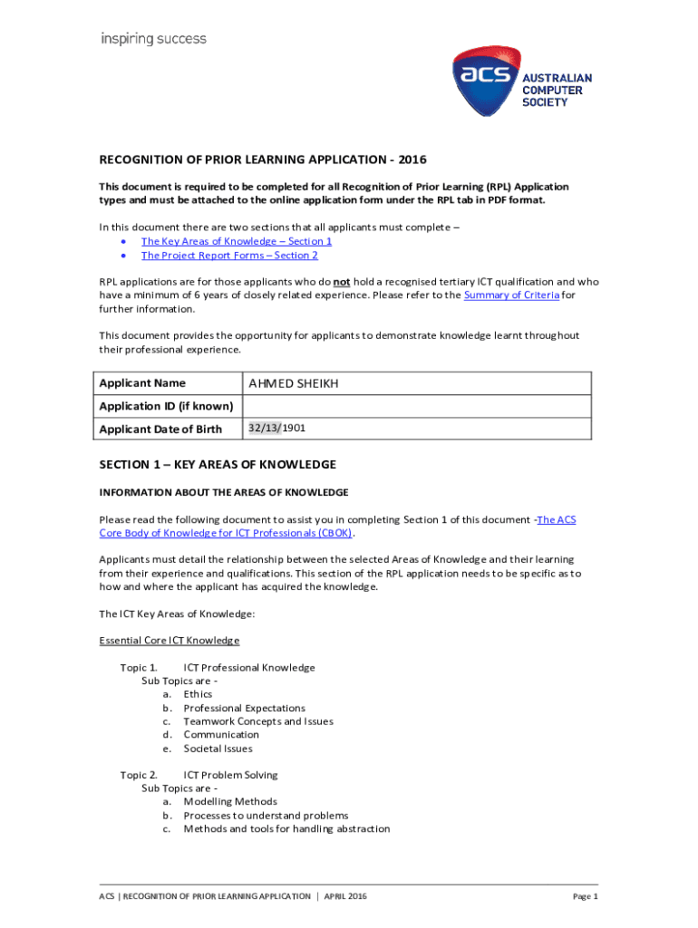 RECOGNITION OF PRIOR LEARNING APPLICATION 2016 This document is required to be completed for all Recognition of Prior Learning (RPM) Application types and must be attached to the online application