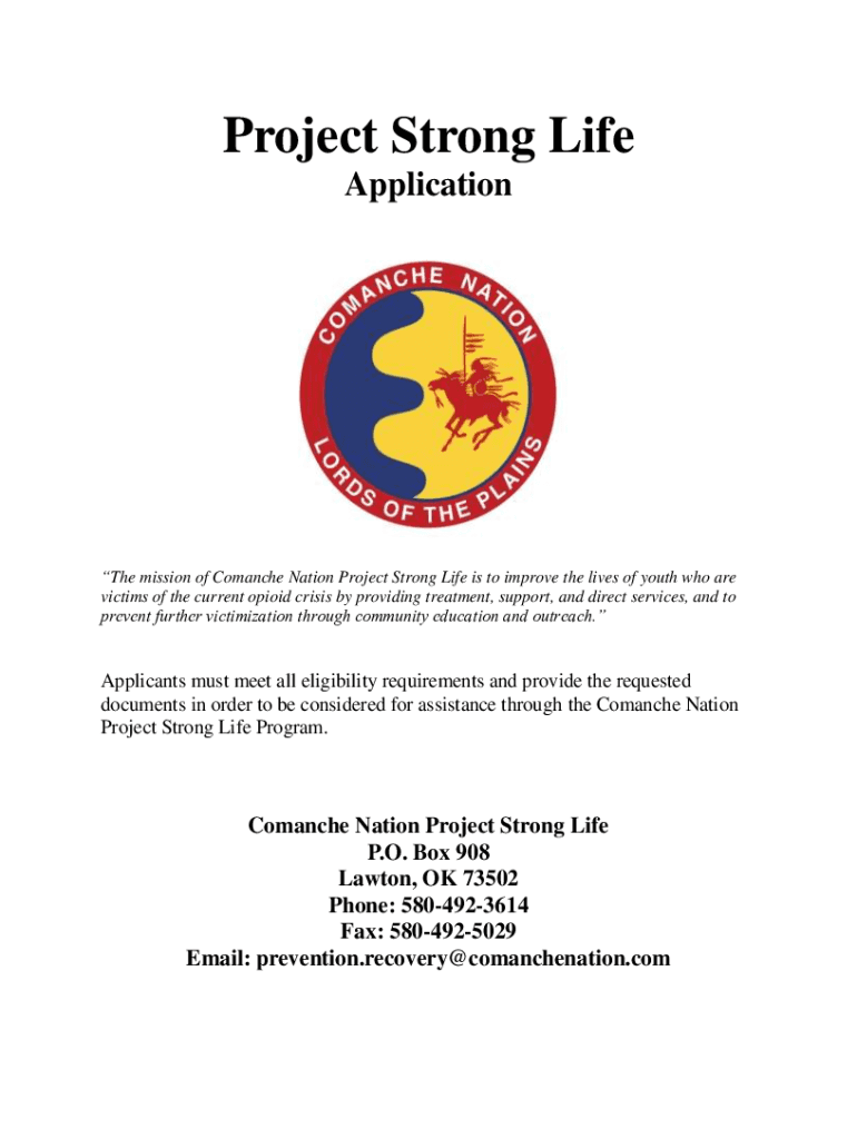 Project Strong Life Application mission of Comanche Nation Project Strong Life is to improve the lives of youth who are victims of the current opioid crisis by providing treatment, support, and direct