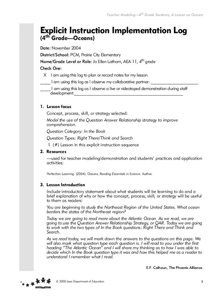 Teacher Modeling4th Grade Students, A Lesson on OceansExplicit Instruction Implementation Log (4th GradeOceans)Date: November 2004 District/School: PCM, Prairie City Elementary Name/Grade Level or
