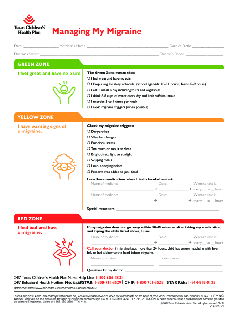 Managing My Migraine Date: ___ Members Name: ___ Date of Birth: ___ Doctors Name: ___ Doctors Phone: ___GREEN ZONE I feel great and have no pain! The Green Zone means that: I feel great and have no