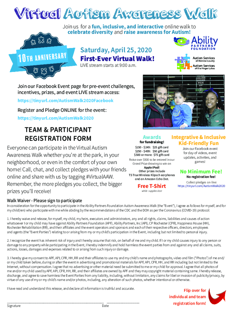 Virtual Autism Awareness Walk Join us for a fun, inclusive, and interactive online walk to celebrate diversity and raise awareness for Autism! Saturday, April 25, 2020, Forever Virtual Walk! LIVE