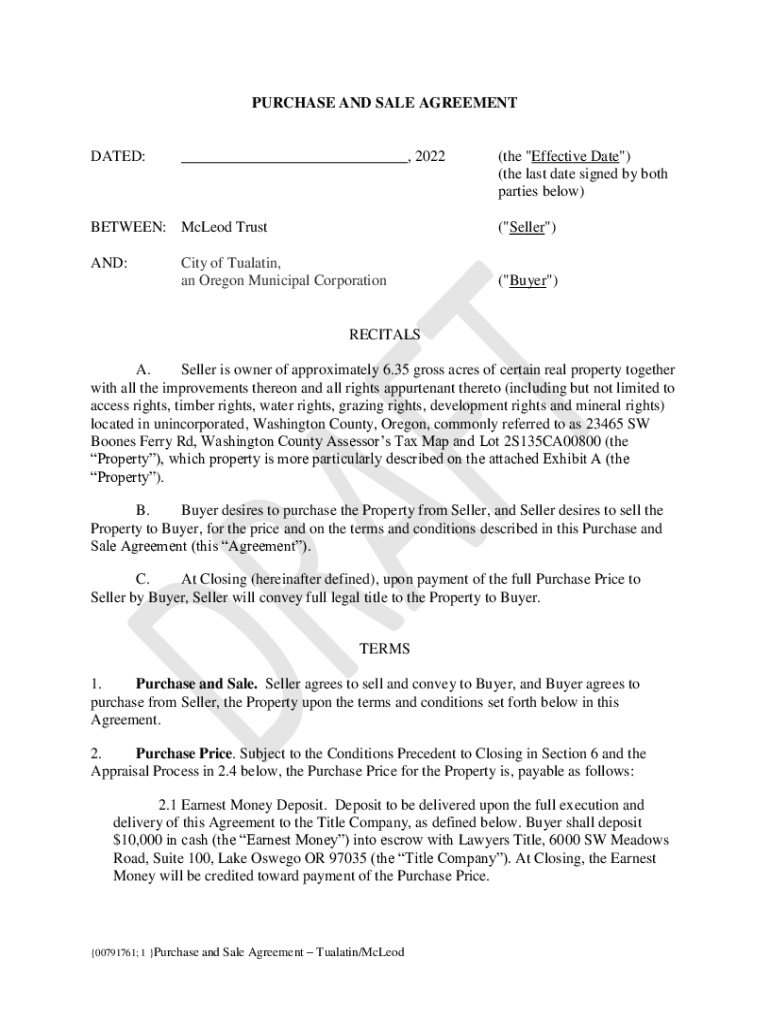 PURCHASE AND SALE AGREEMENTDATED:, 2022BETWEEN: McLeod Trust AND:(the \” Effective Date\”) (the last date signed by both parties below) (\” Seller\”)City of Tualatin, an Oregon Municipal Corporation(\”