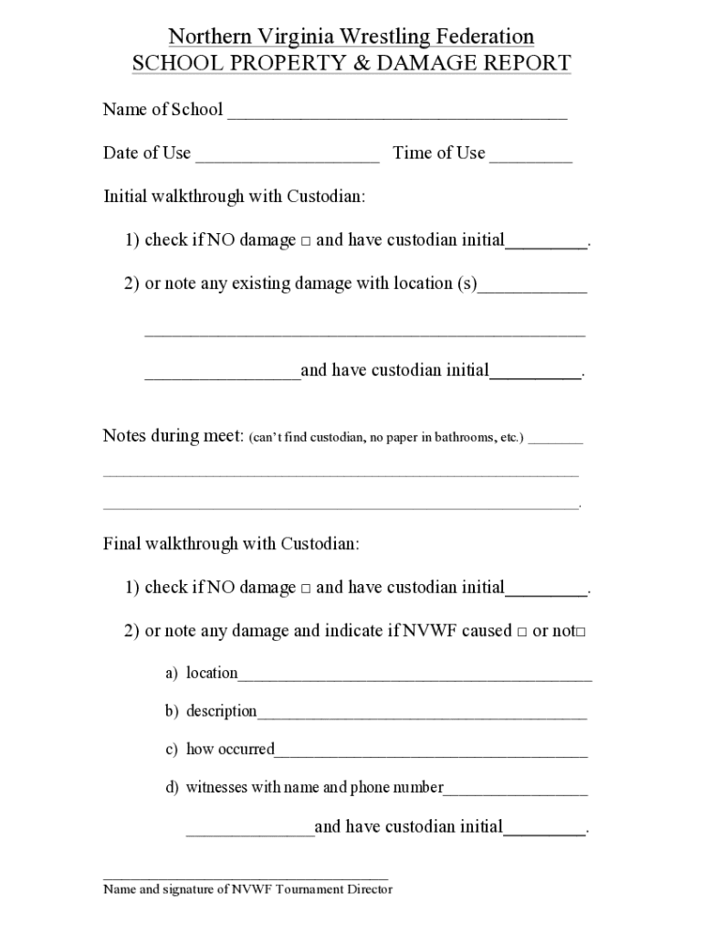 Northern Virginia Wrestling Federation SCHOOL PROPERTY & DAMAGE REPORT Name of School ___ Date of Use ___ Time of Use ___ Initial walkthrough with Custodian: 1) check if NO damage and have custodian