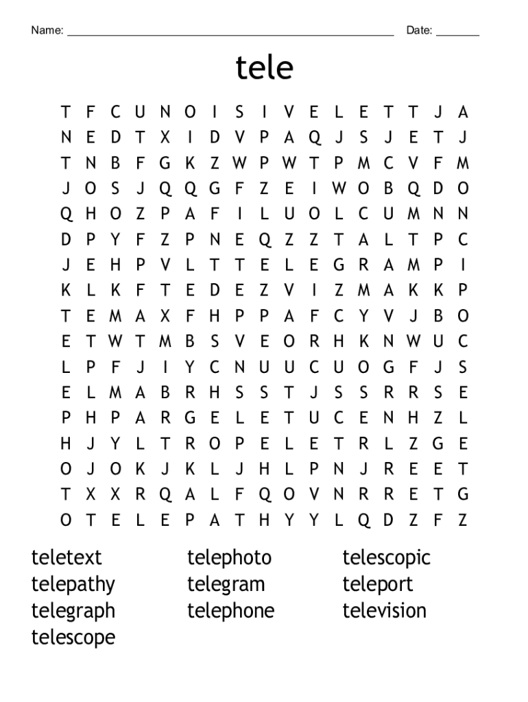 Name: ___ Date: ___tell T N T J Q D J K T E L E P H O T OF E N O H P E L E T P L H J J X TC D B S O Y H K M W F M P Y O XE teletext telepathy telegraph telescope T F J Z F P F A T J A A L K R LN X