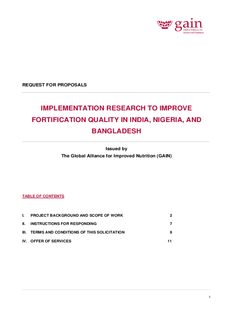 REQUEST FOR PROPOSALSIMPLEMENTATION RESEARCH TO IMPROVE FORTIFICATION QUALITY IN INDIA, NIGERIA, AND BANGLADESH Issued by The Global Alliance for Improved Nutrition (GAIN)TABLE OF CONTENTS.PROJECT