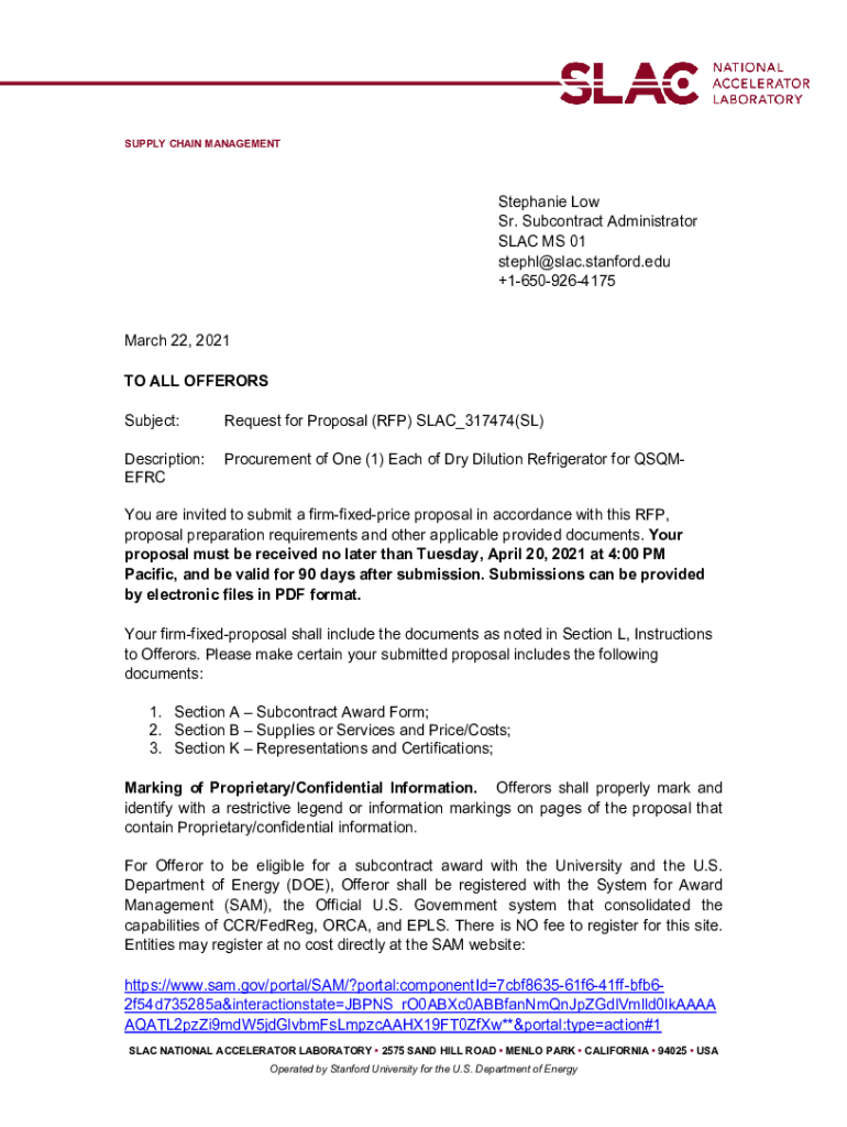 SUPPLY CHAIN MANAGEMENT Stephanie Low Sr. Subcontract Administrator SLAB MS 01 stephl@slac.stanford.edu +16509264175 March 22, 2021, TO ALL OFFER ORS Subject:Request for Proposal (RFP) SLAB_317474(SL)Description: