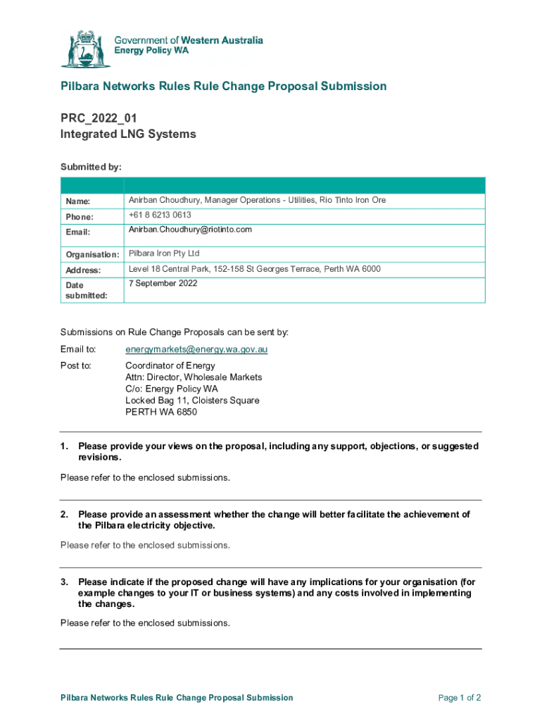 Pillar Networks Rules Rule Change Proposal Submission PRC_2022_01 Integrated LNG Systems Submitted by:Name:Airbag Choudhury, Manager Operations Utilities, Rio Tinto Iron Freephone:+61 8 6213 0613Email:Airbag.Choudhury@riotinto.comOrganisation:Pillar