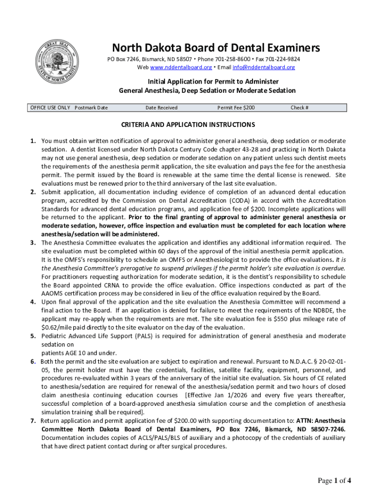 North Dakota Board of Dental Examiners PO Box 7246, Bismarck, ND 58507 Phone 7012588600 Fax 7012249824 Web www.nddentalboard.org Email info@nddentalboard.orgInitial Application for Permit administering