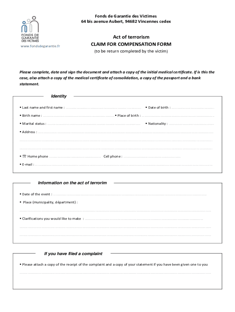 Get the free Act of terrorism CLAIM FOR COMPENSATION FORM