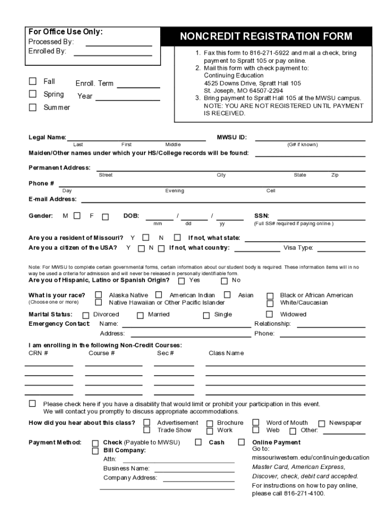 For Office Use Only:NONCREDIT REGISTRATION Reprocessed By: Enrolled By:Fallen roll. TermSpringYear1. Fax this form to 8162715922 and mail a check, bring payment to Pratt 105 or pay online. 2. Mail