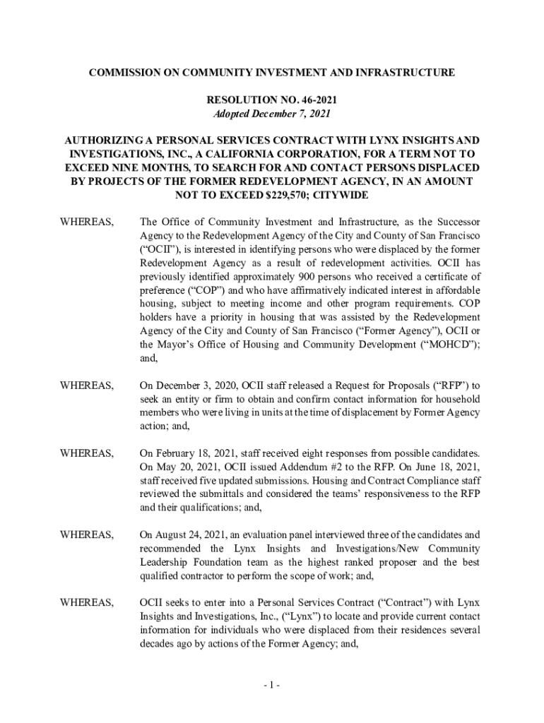 COMMISSION ON COMMUNITY INVESTMENT AND INFRASTRUCTURE RESOLUTION NO. 462021 Adopted December 7, 2021, AUTHORIZING A PERSONAL SERVICES CONTRACT WITH LYNX INSIGHTS AND INVESTIGATIONS, INC., A CALIFORNIA